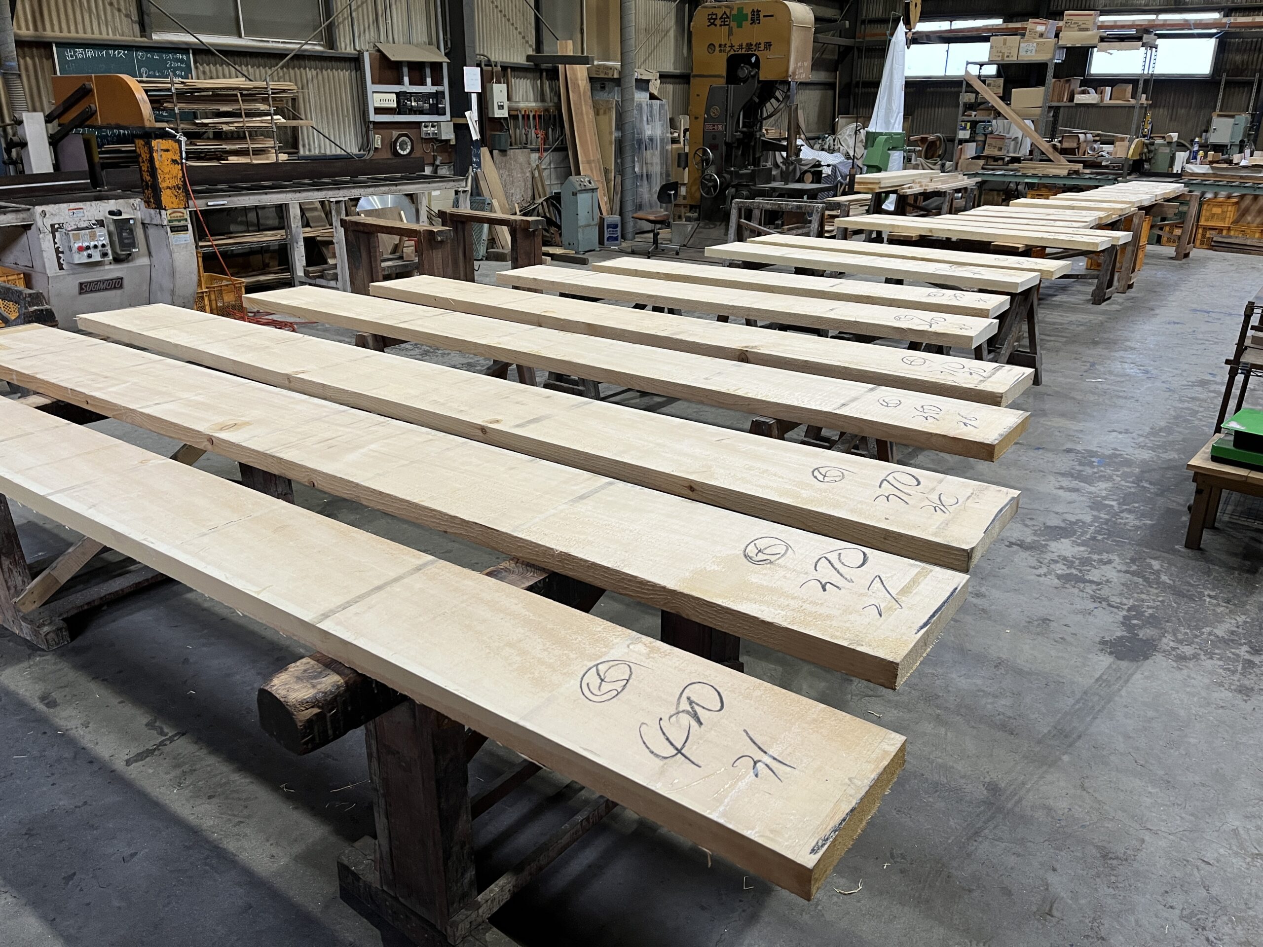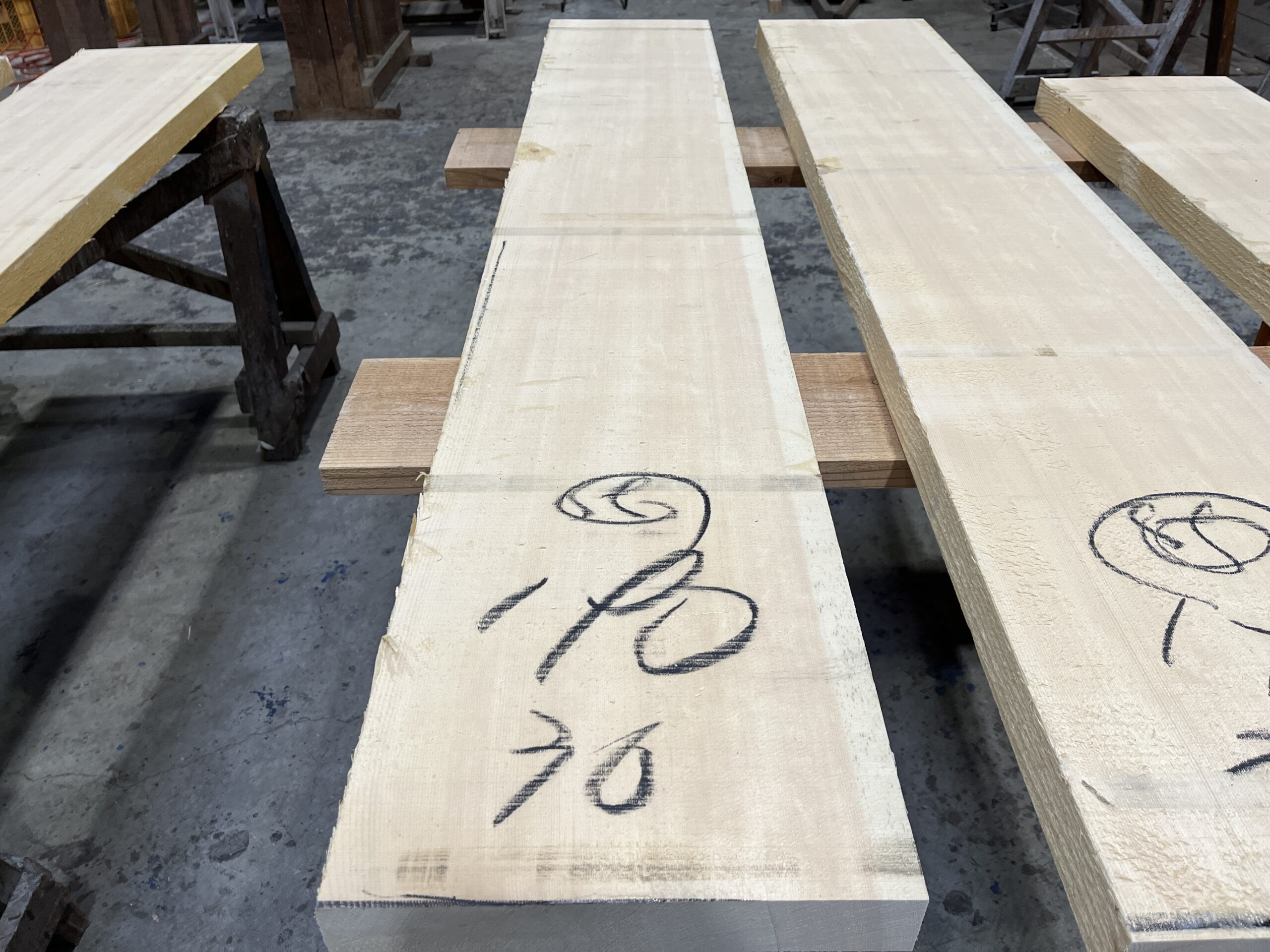 長い時間をかけてじっくりと乾燥させていたスプルース柾目の厚板が、ようやく乾燥しました。