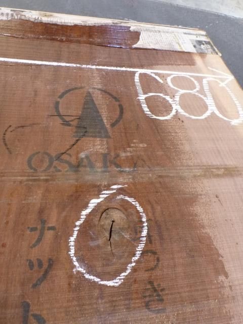 原木番号:503038、オハイオ産、人工乾燥材、大節2コ貫通、木表カラス有り、木裏芯残る カラス有り、赤身 木表85% 木裏90%、約60kg