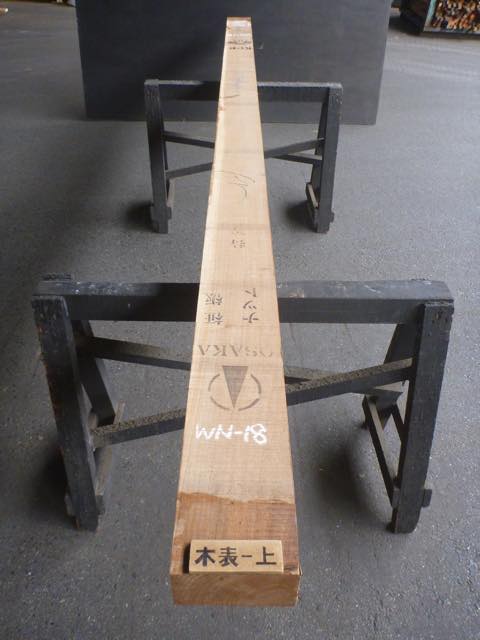 原木番号:228772、木表無節、木裏ワレ少し有り、赤身木表85%以上、長さ3600ミリ有り、天然乾燥材、約32kg