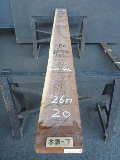 原木番号:504263、オハイオ産、人工乾燥材、木表無節 うす割れほんの少し 変色ほんの少し、木裏中節1コ、赤身 木表85% 木裏90%、約61kg