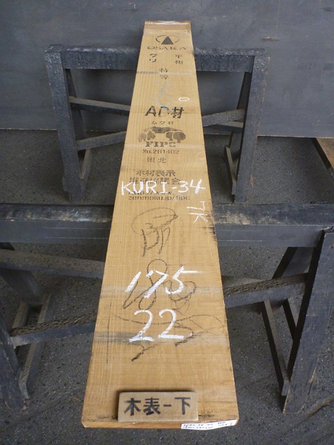 栗材の一枚板は、北海道・東北から厳選した丸太を仕入れ、自社工場で丹念に製材しています。明るく落ち着いた色合いと美しく鮮やかな木目が特徴で、高級家具の材料として広く愛用されています。また、保存性が極めて高いことから船舶の梶棒など耐久性が求められる用途にも使われ、近年、ナラ材の価格高騰により、クリ材の需要が徐々に拡大しています。天然木ゆえの葉節は、クリ材特有の個性としてご理解いただき、その味わいをお楽しみください。